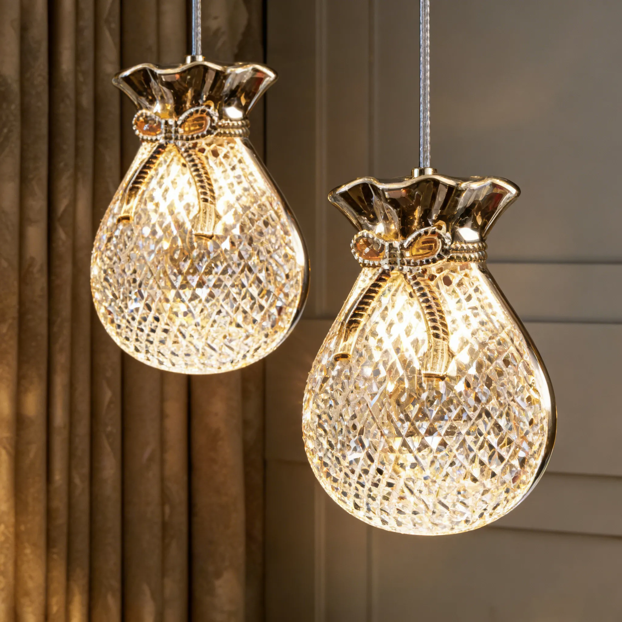 Faceted crystal-like shades inspired by the shape of a money pouch are accented with refined metal details, creating sparkling reflections and a luxurious yet contemporary decorative effect.