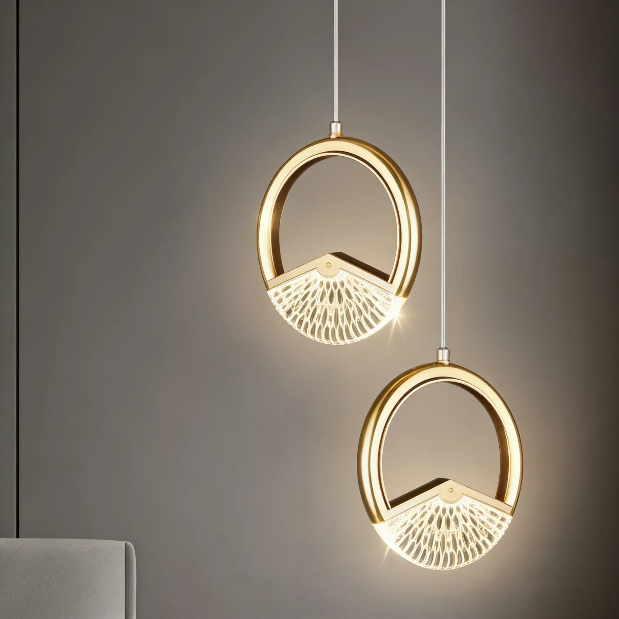 A sleek metal circular frame paired with a lower section featuring crystal-textured shade, creating layered light diffusion and a refined contemporary glow with elegant visual depth.