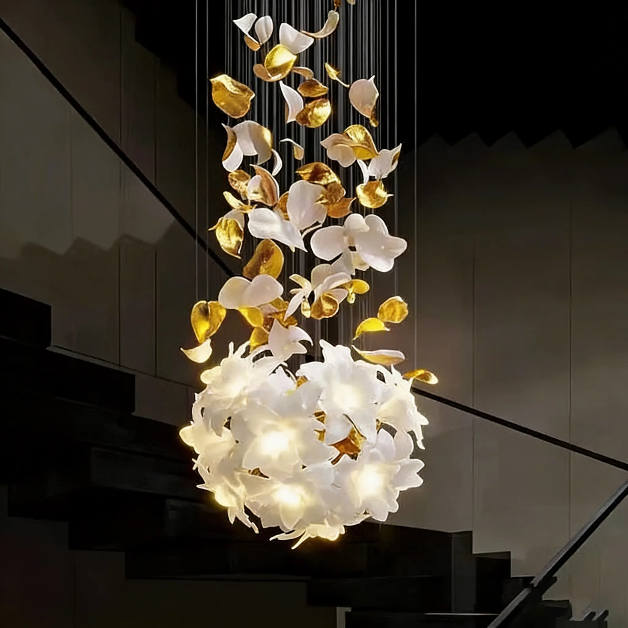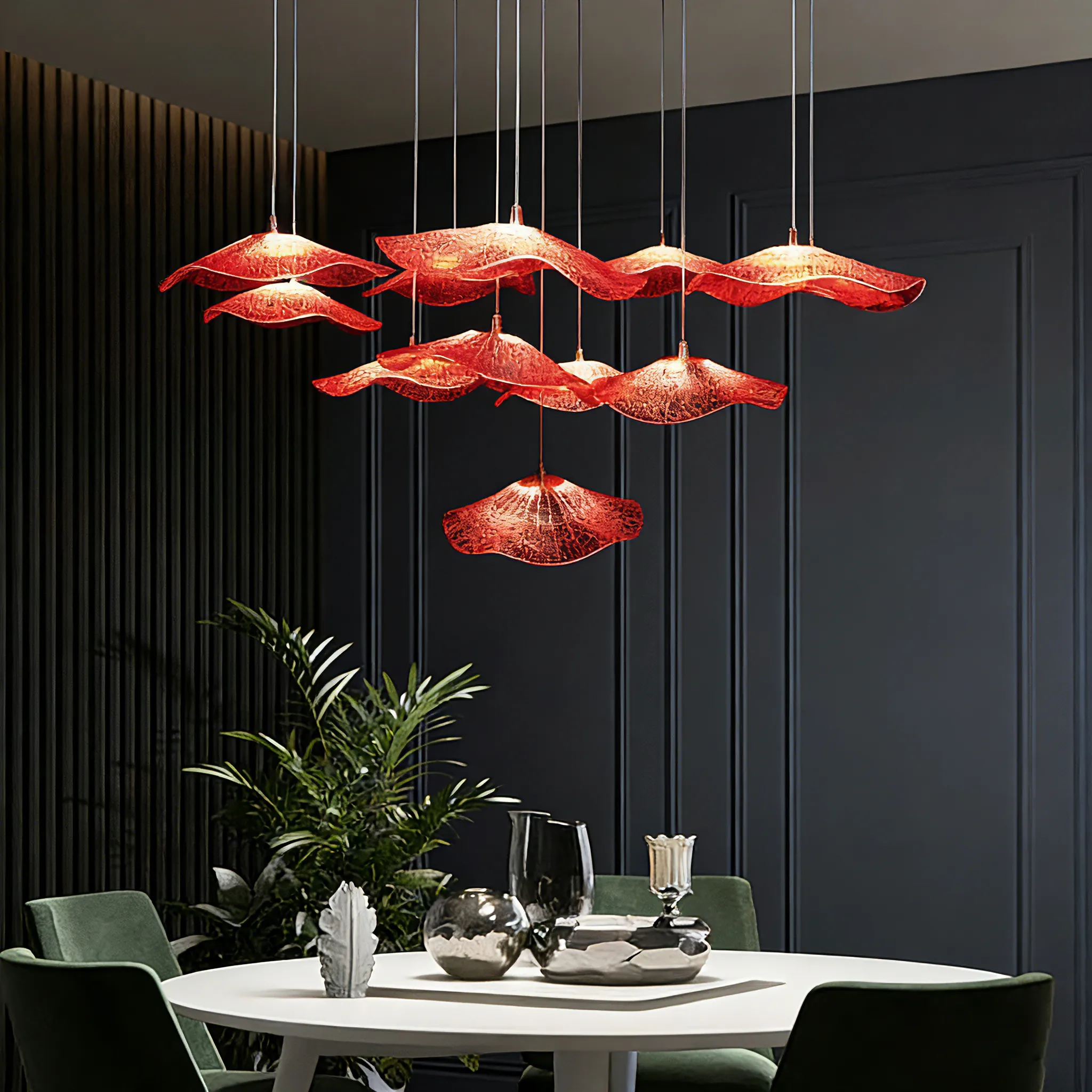 With its distinctive petal-shaped form and refined gold accents, this piece stands out among artistic pendant lights, bringing a lively yet elegant atmosphere to the space.