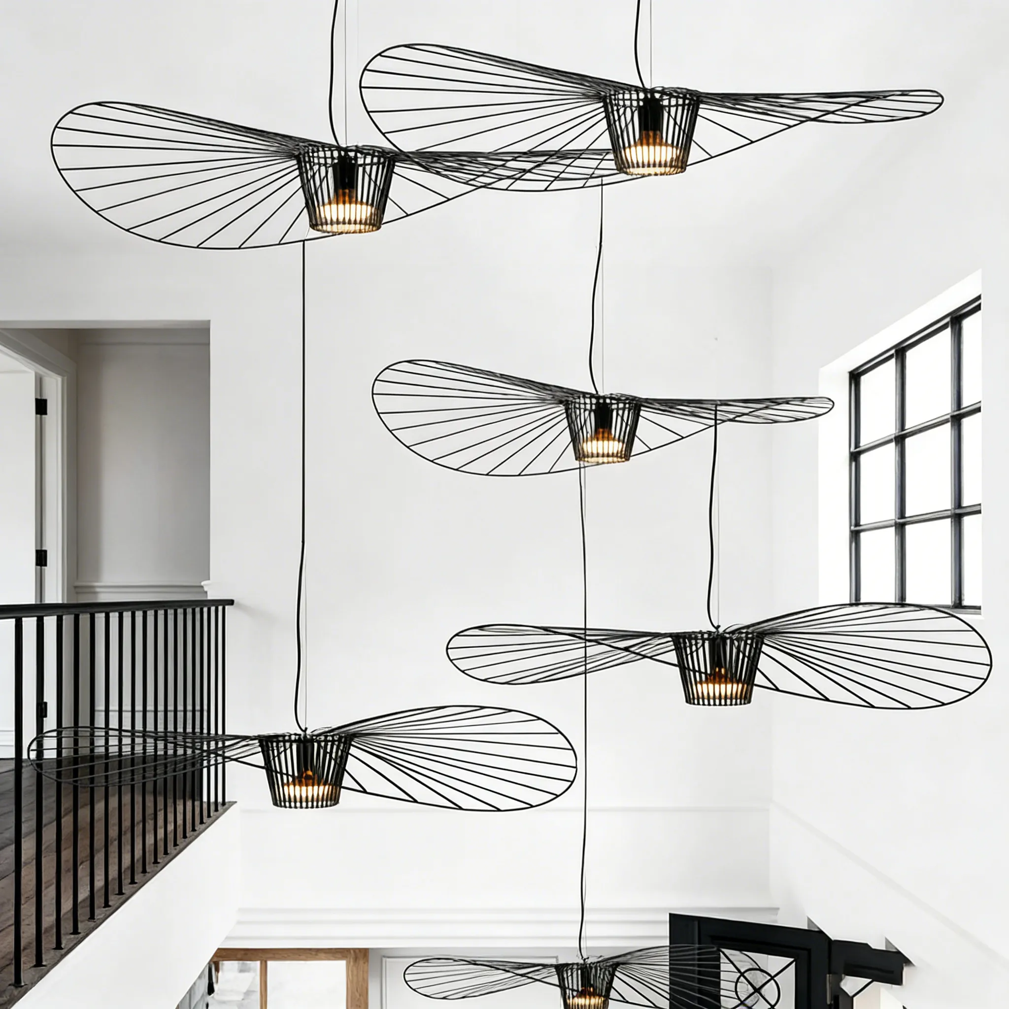 With black wing-like line shades and a multi-drop arrangement, these artistic chandeliers create an installation-style statement for double-height spaces.