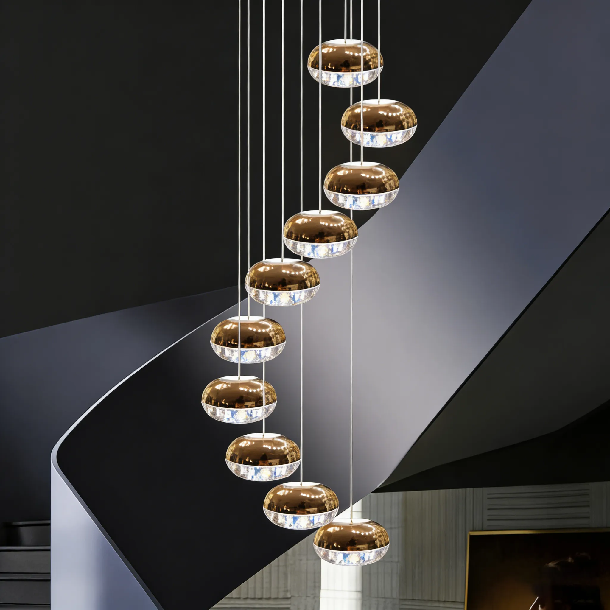 Mirror-finish metal discs are paired with crystal light rings along the lower edge, suspended in a staggered multi-light composition that creates depth, brilliance, and a refined contemporary ambiance.