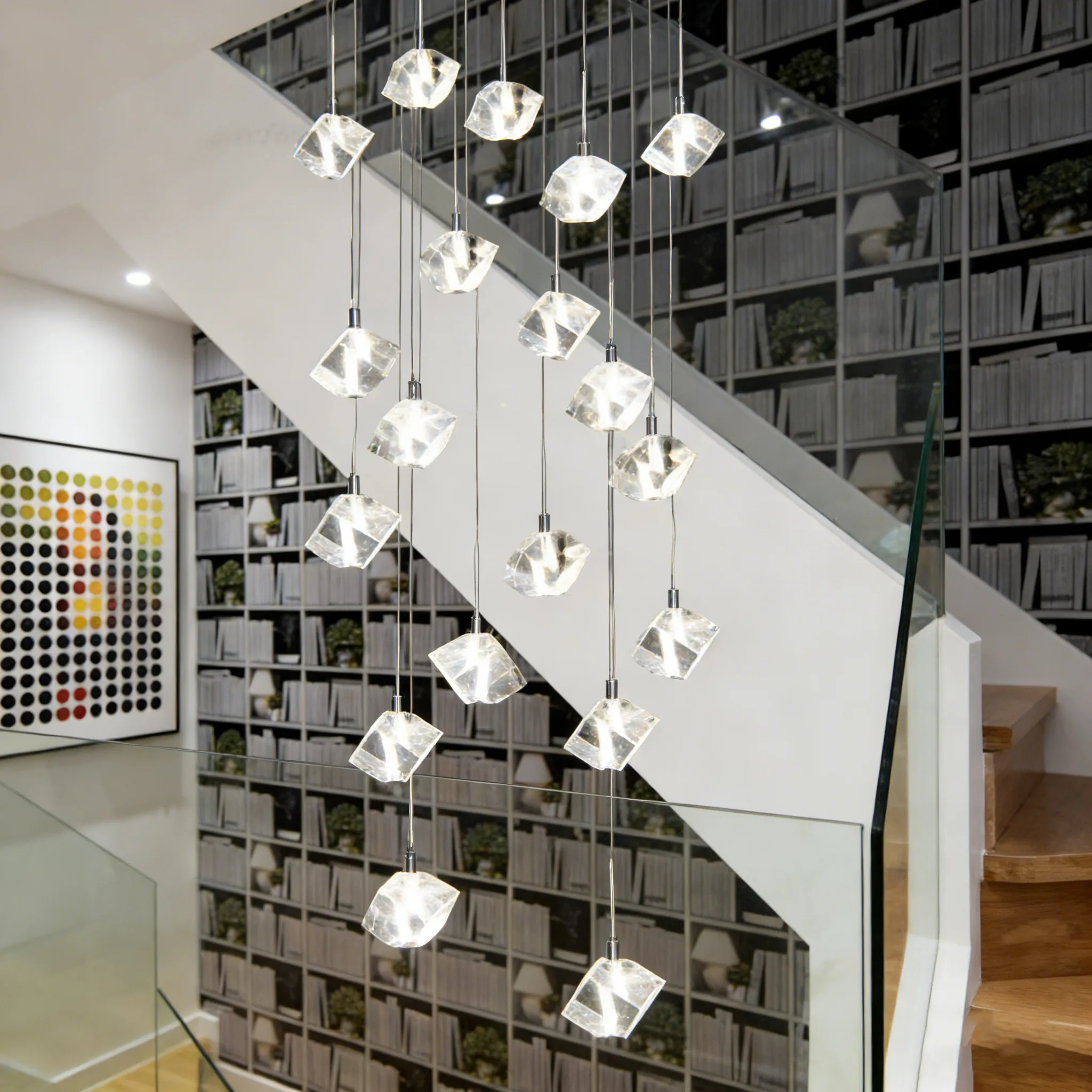 Irregular geometric crystal light bodies are suspended at varying heights, creating a dynamic, layered composition with sparkling reflections and a refined contemporary character.
