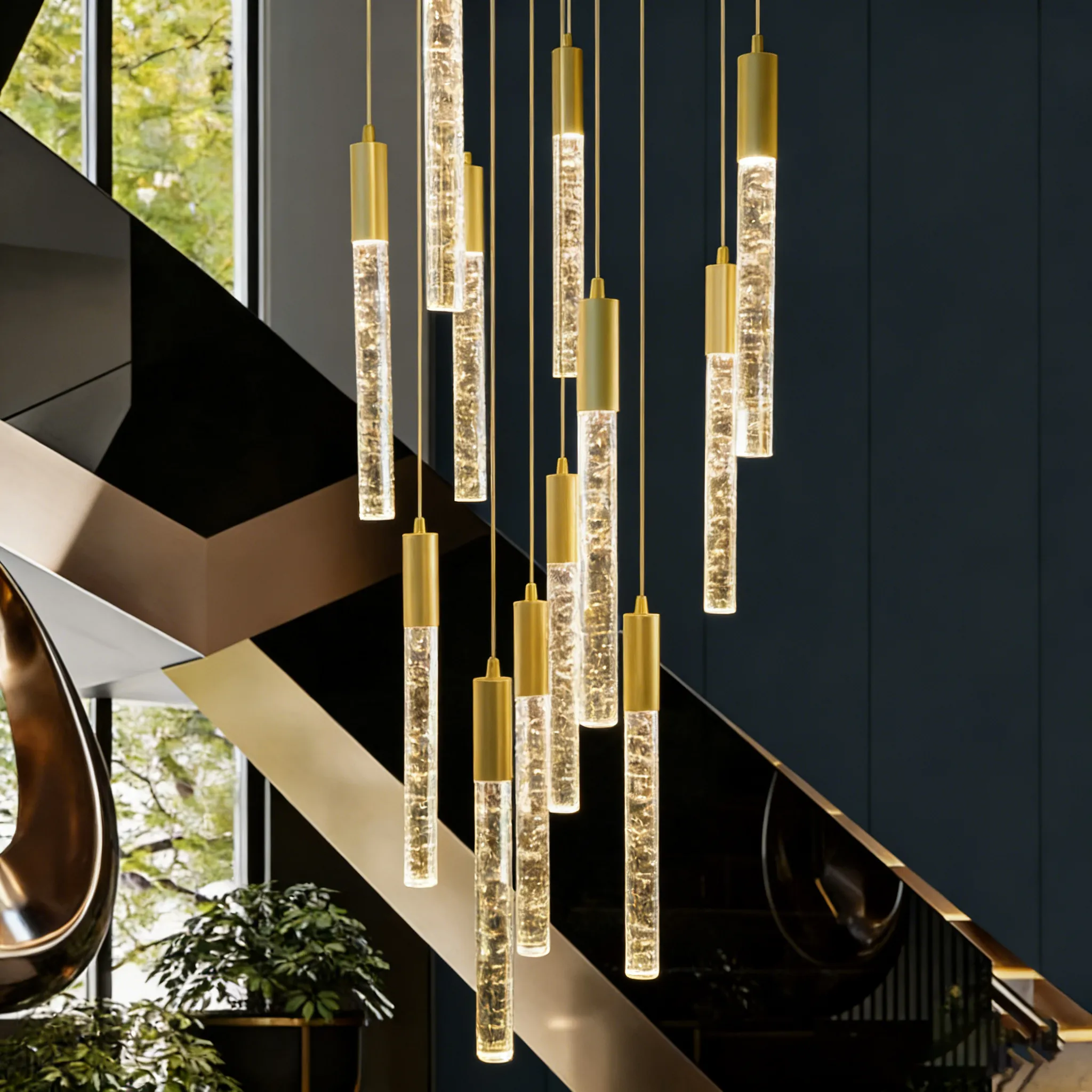 Featuring elongated crystal light columns combined with a streamlined metal frame, this multi-light design delivers a balanced, elegant glow with a strong sense of vertical rhythm and modern sophistication.