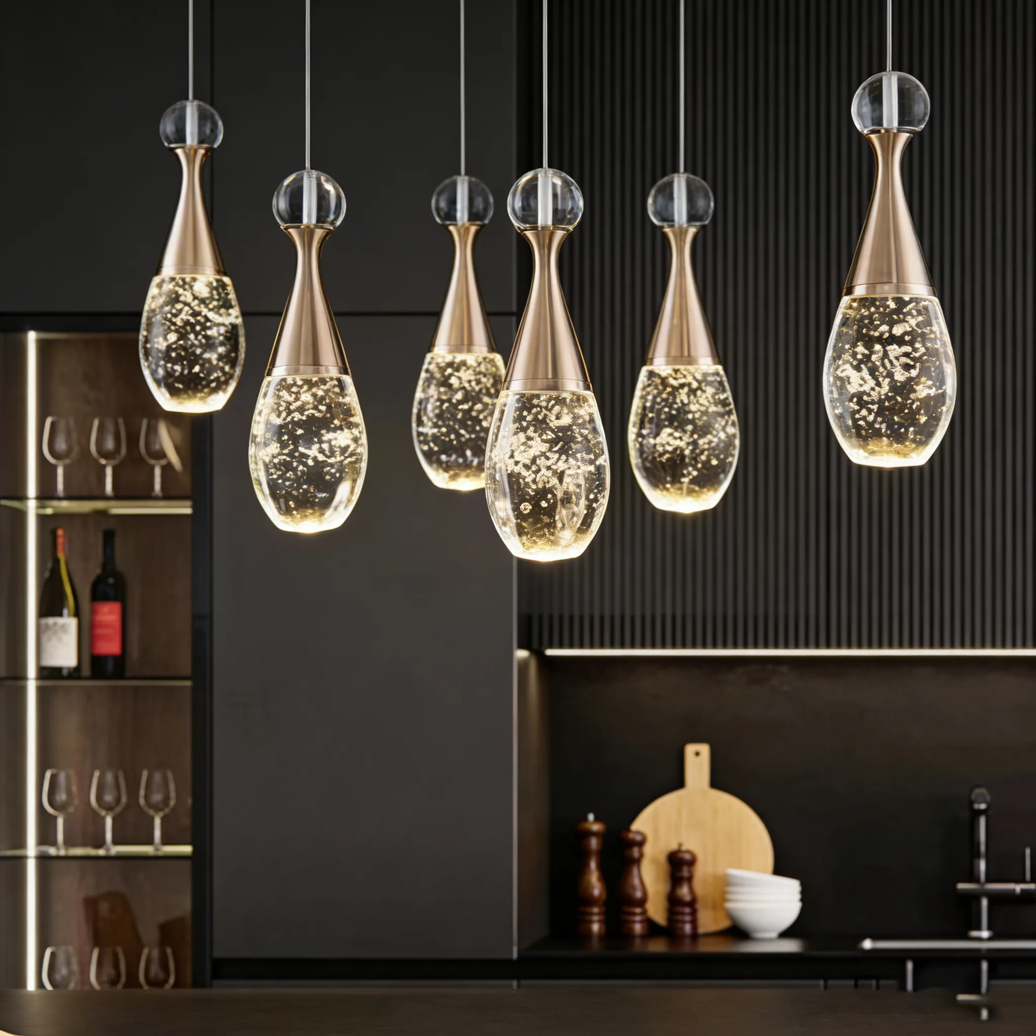 Featuring water-drop shaped glass shades crafted with dense, delicate bubble textures, this multi-light chandelier creates a sparkling, layered glow and an elegant contemporary atmosphere.