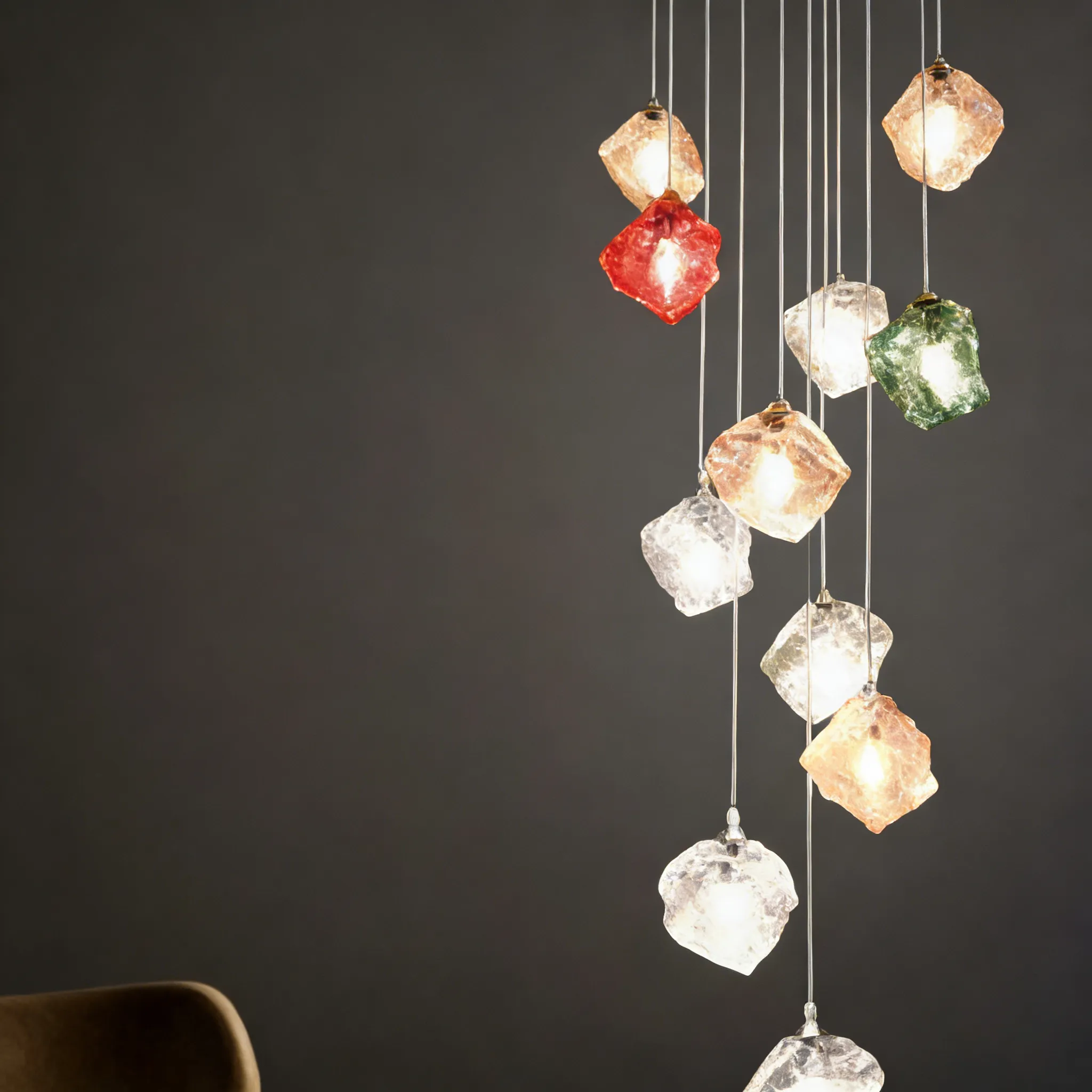 Irregular crystal-stone shades hang in a staggered cascade, creating a sculptural art glass chandelier statement with sparkling depth.