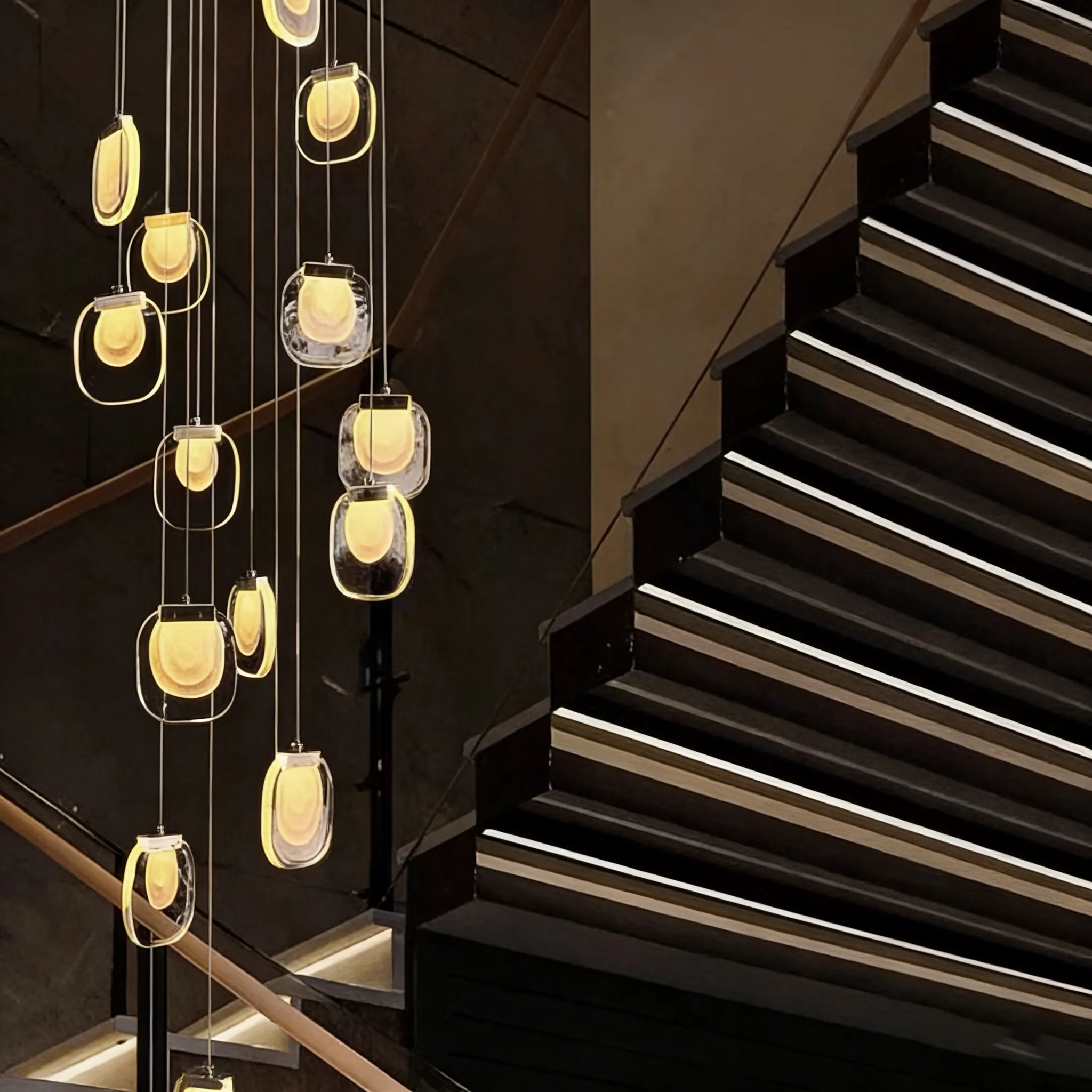 Designed for stairwells and tall vertical spaces, this glass chandelier creates a layered, cascading statement with elegant depth.