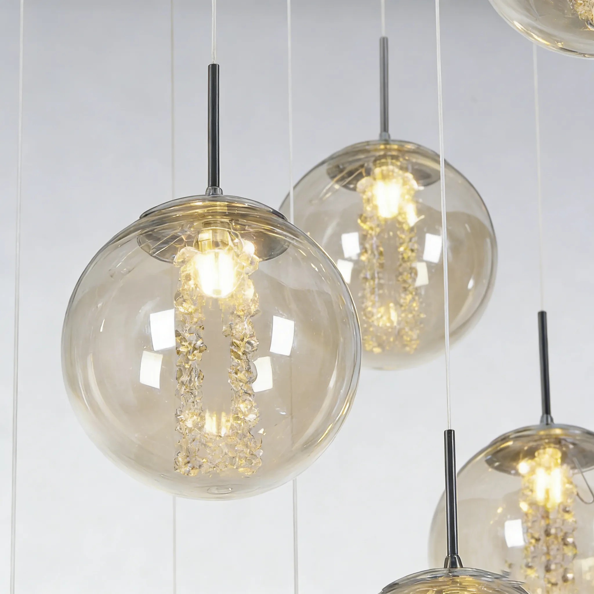 Clear glass globes feature an integrated crystal light column, creating a refined clear glass sphere chandelier look with sparkling depth.
