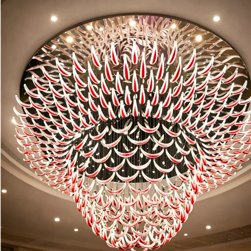 Defined by a vivid interplay of white and red tones, this chandelier delivers rich layering and a strong sense of spatial focus at the center of the ceiling. Its full, rhythmic silhouette balances contemporary artistic expression with Oriental decorative elegance, elevating the ceremonial character and visual identity of the space.