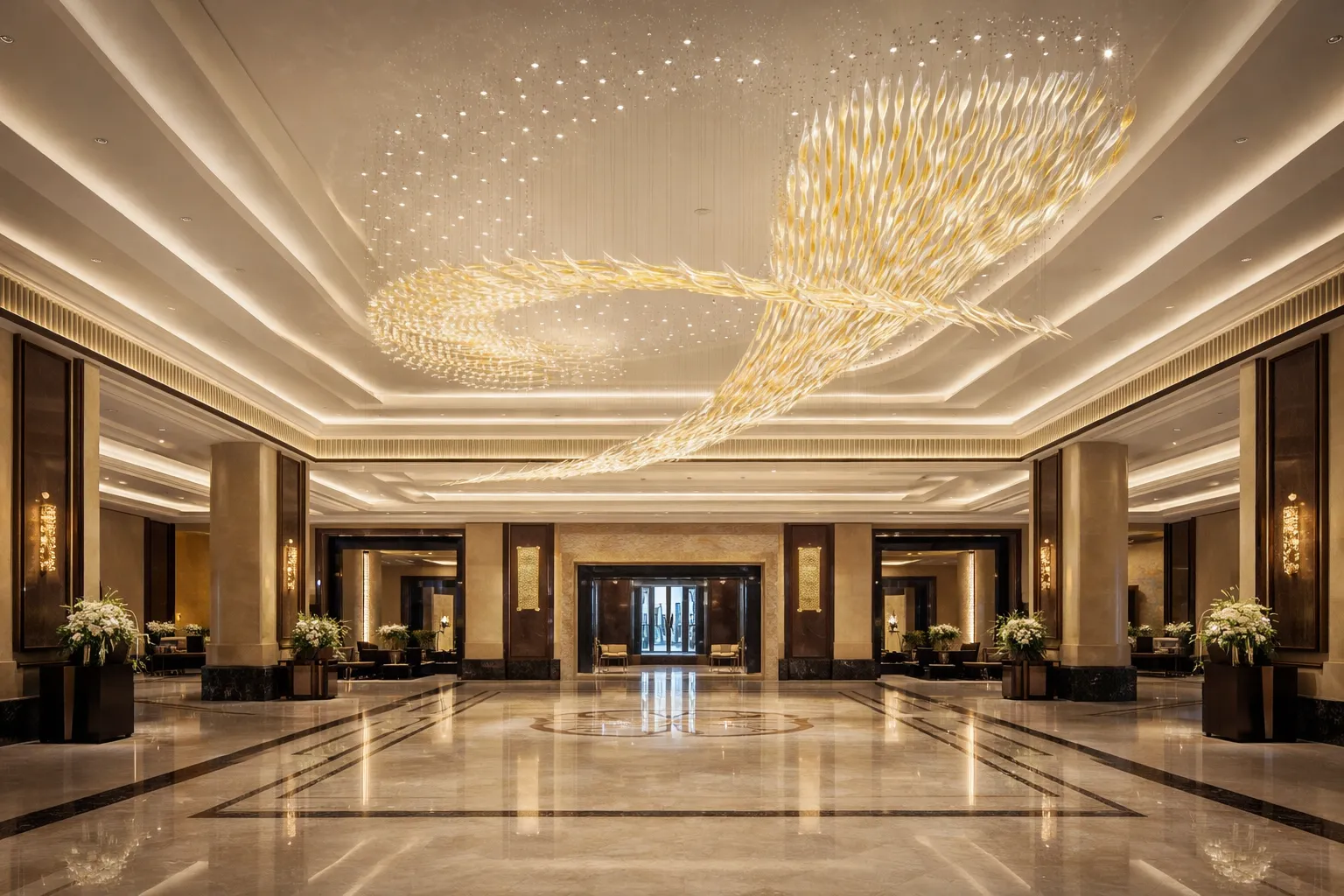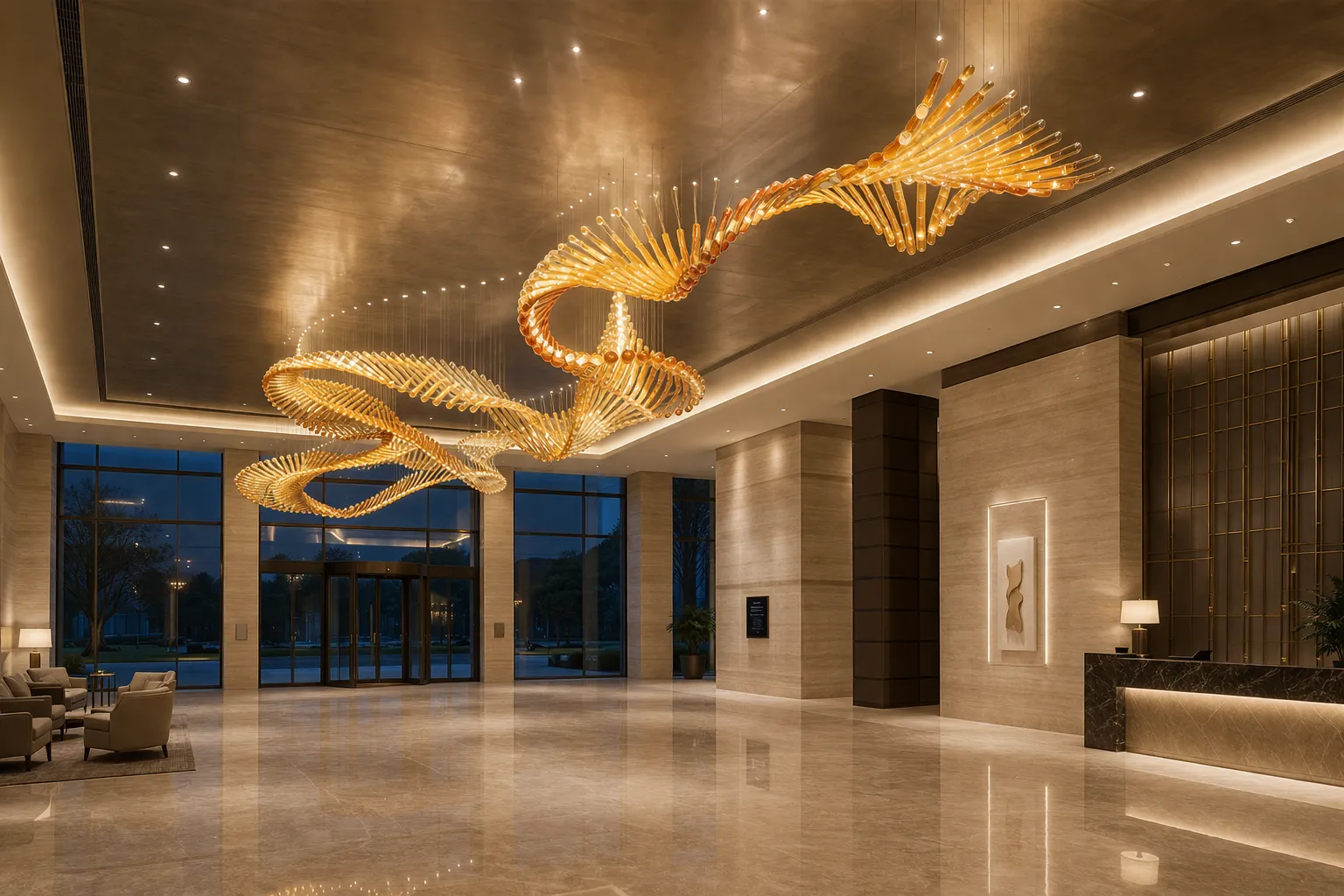 A luxury lobby concept featuring a wave-shaped gold ceiling chandelier, soft layered lighting, and a grand symmetrical layout.