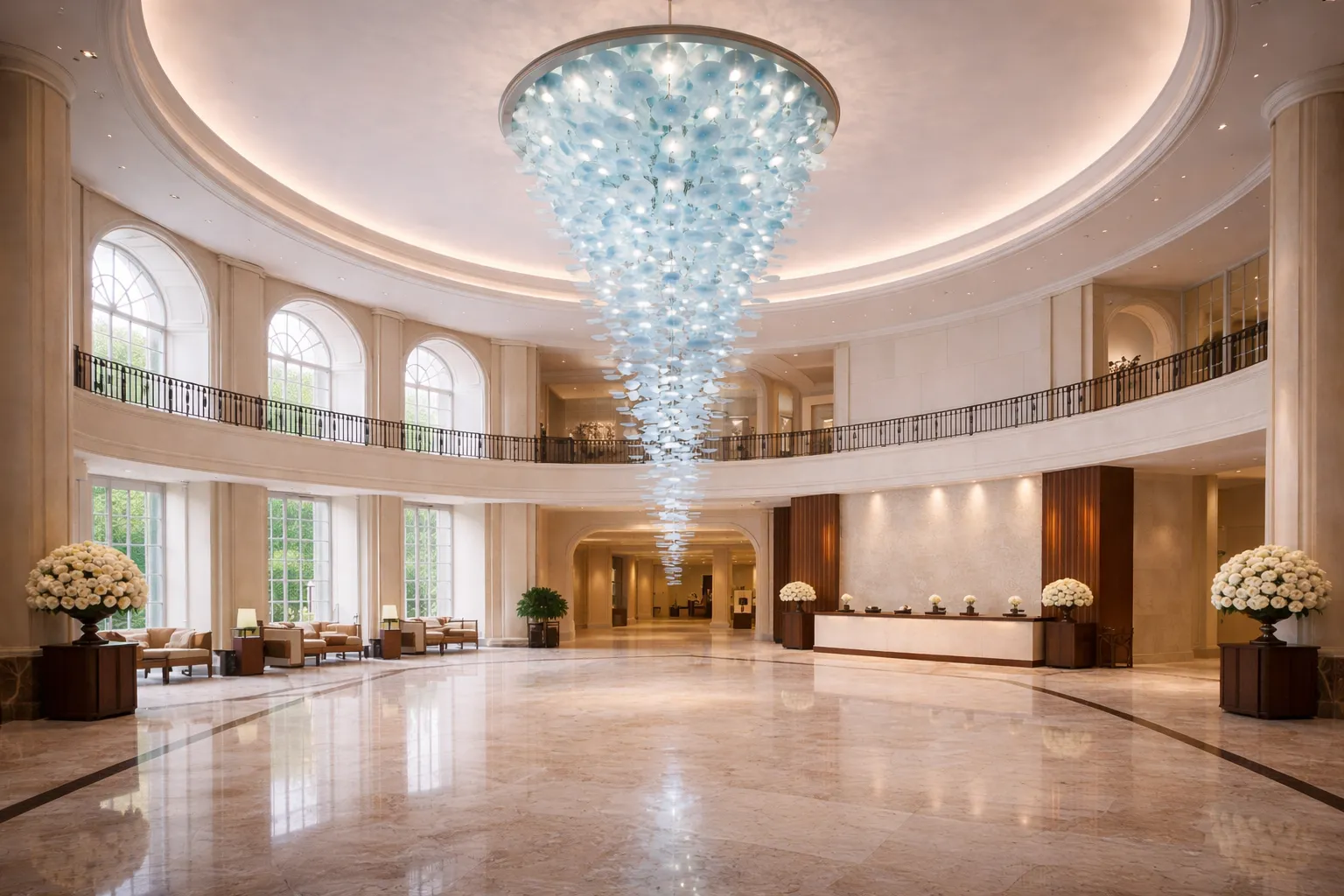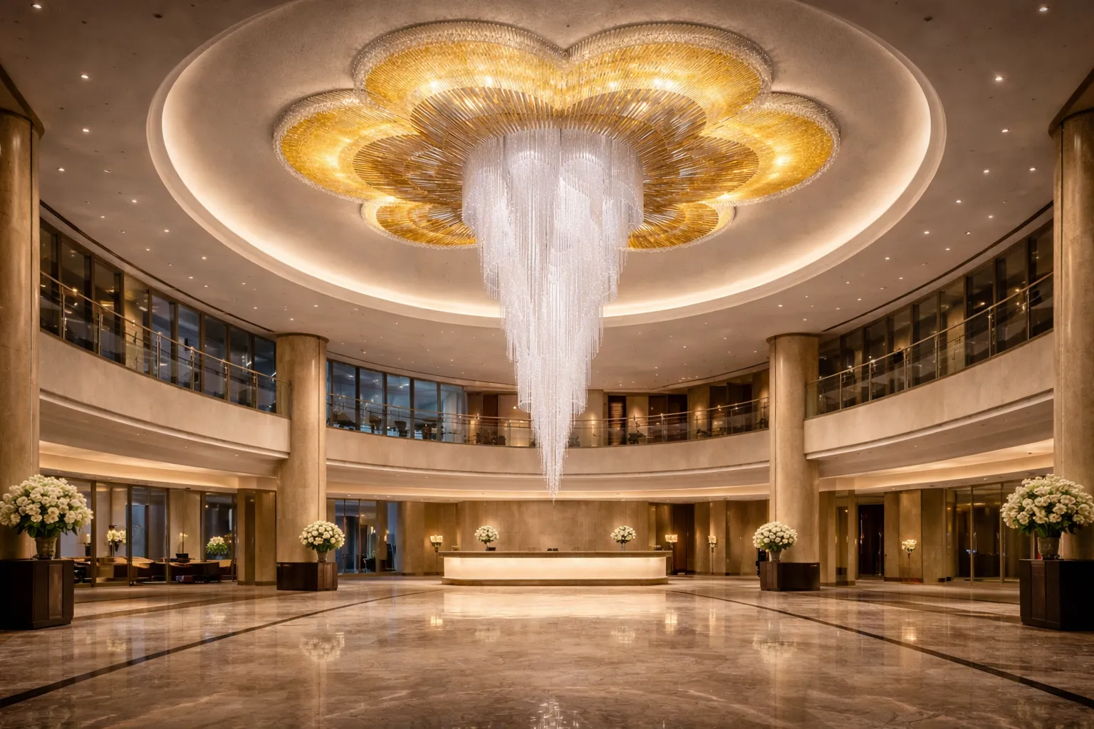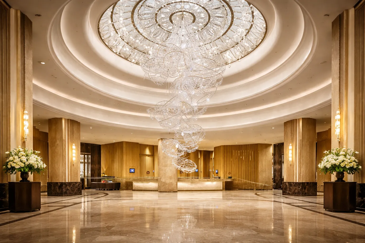 Short Feature Description: A grand lobby concept featuring a cascading spiral crystal chandelier, circular ceiling detailing, and a refined luxury ambiance.