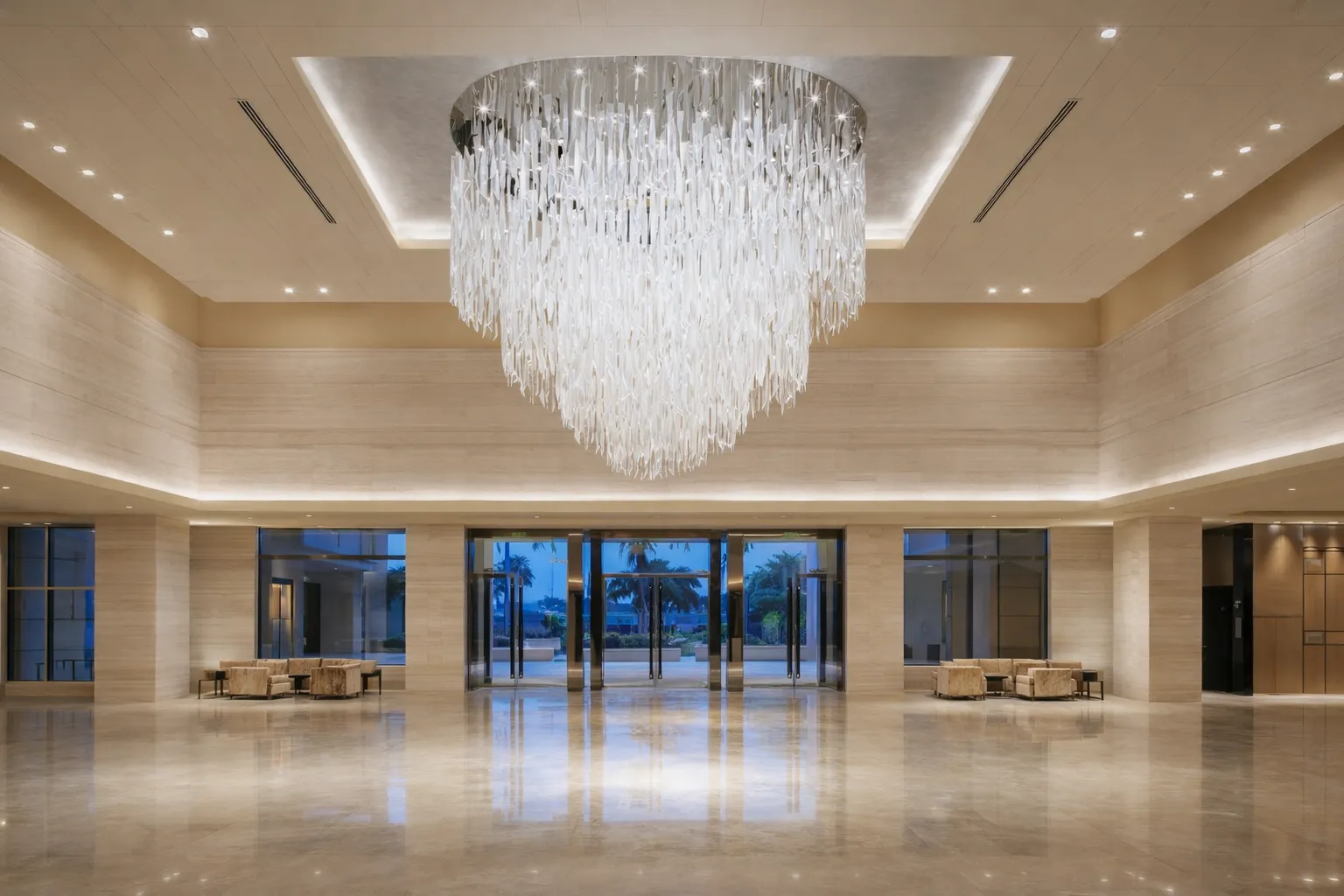 A refined, high-end lobby concept featuring a statement chandelier, warm neutral materials, and an open spatial layout to create an elegant first impression.
