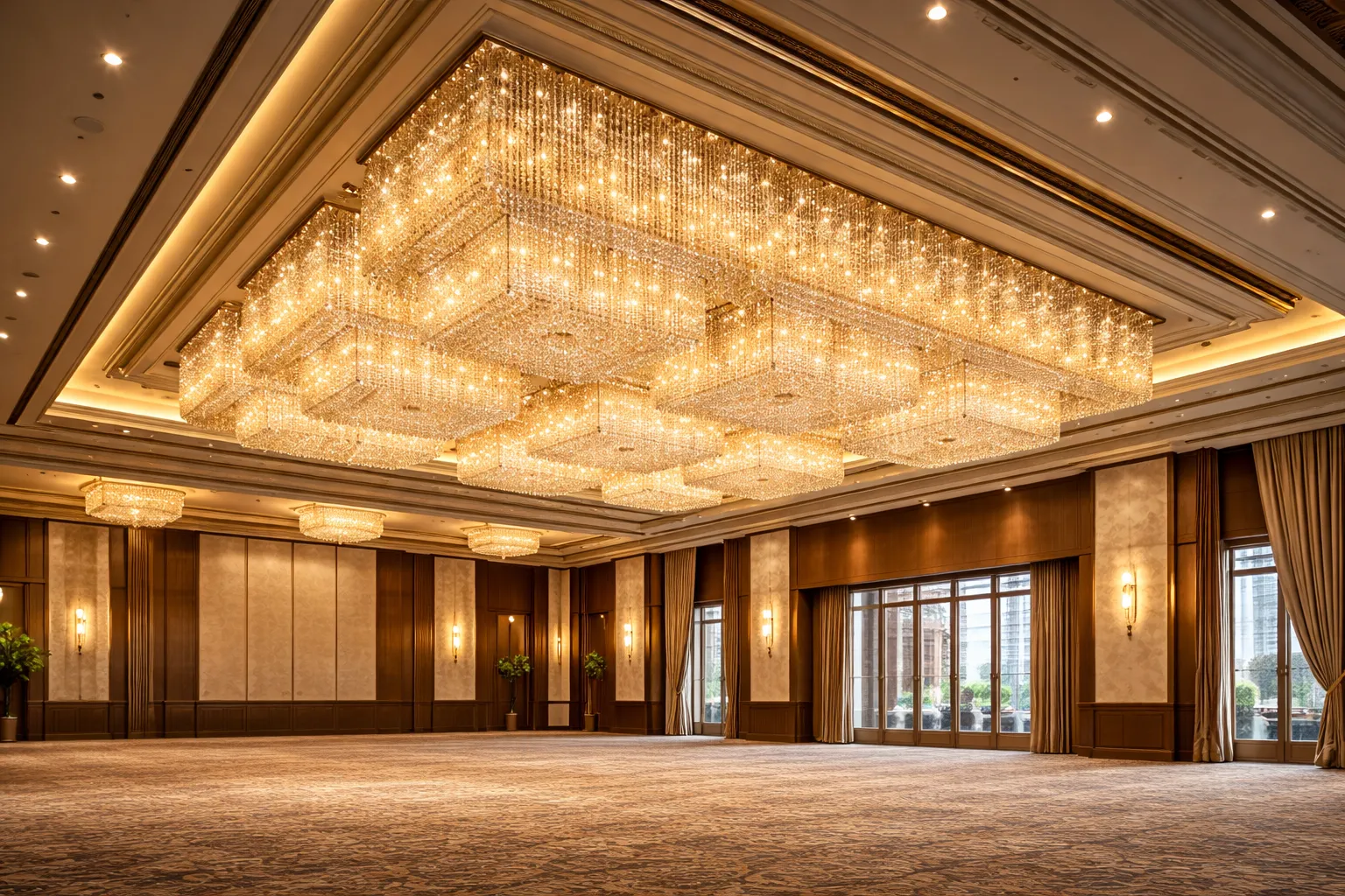 Short Feature Description: A grand ballroom lighting concept featuring oversized rectangular crystal chandeliers, layered ceiling integration, and a warm luxury atmosphere.