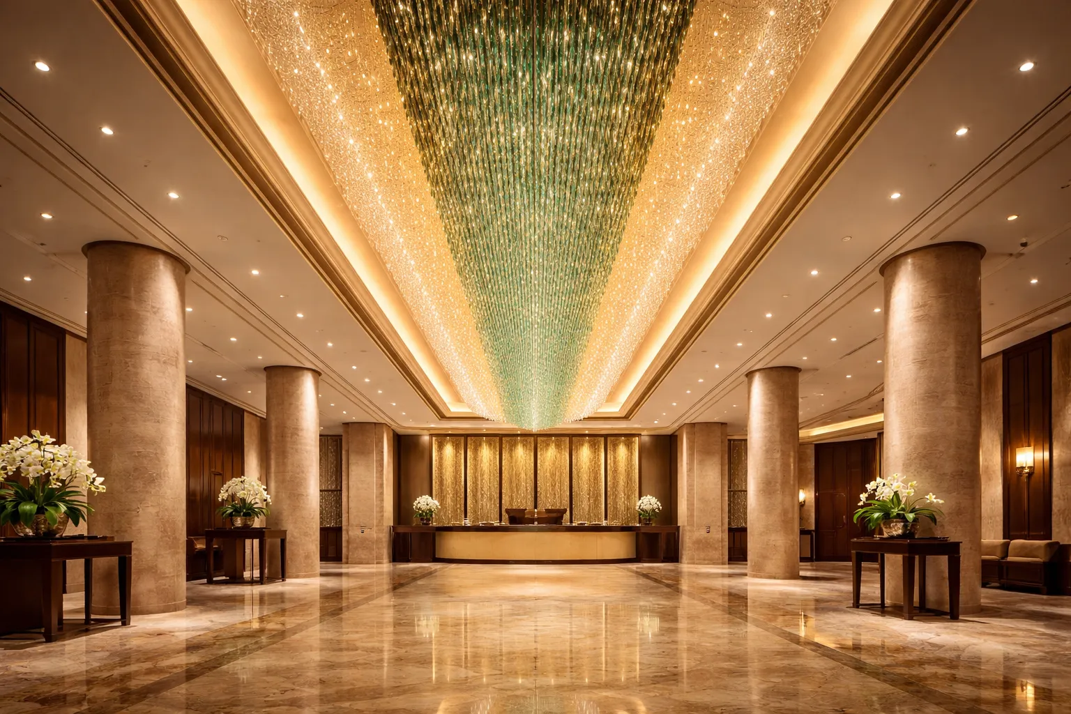 Short Feature Description: A luxury lobby concept featuring a long green crystal ceiling chandelier, symmetrical columns, and a warm premium ambiance.